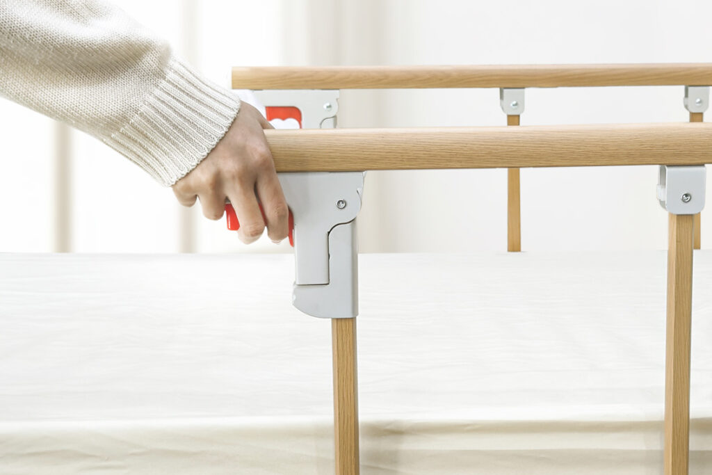 - ราวกั้นเตียงแบบสไลด์ ปรับขึ้น-ลงได้ด้วยมือเดียว สะดวกต่อการใช้งาน และสามารถพับซ่อนไปกับเตียง